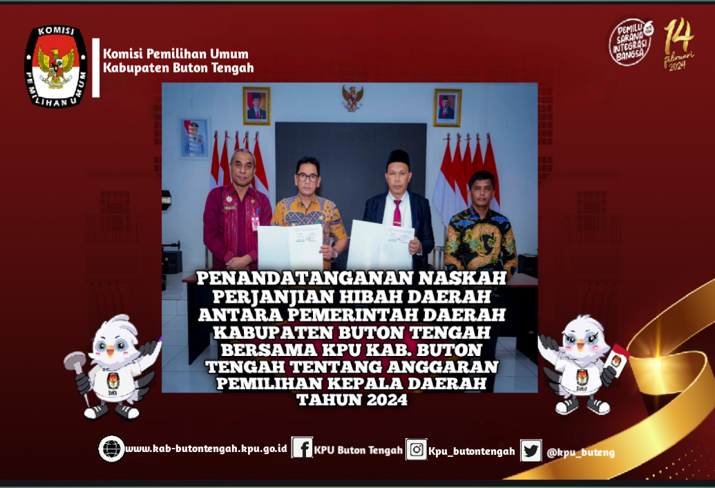 Pj Bupati Buton Tengah (Buteng) Andi Muhammad Yusuf bersama jajaran Komisi Pemilihan Umum Daerah (KPUD) dan Badan Pengawasan Pemilihan Umum (Bawaslu) Buteng melakukan penandatanganan Perjanjian Naskah Perjanjian Hibah Daerah (NPHD), di Aula Kantor Bupati Buton Tengah, Jumat (3/11/2023). Penandatanganan NPHD antara Pemerintah Kabupaten (Pemkab) Buteng dengan KPUD dan Bawaslu adalah dalam rangka penyelenggaraan Pemilu tahun 2024. Pj Bupati, Andi Muhammad Yusuf dalam sambutannya menyampaikan apresiasi dan ucapan terima kasih kepada KPUD dan Bawaslu Buteng serta tim pemerintah daerah yang telah merampungkan pembahasan dan kesepakatan bersama untuk anggaran masing-masing instansi di Pemilu 2024 mendatang. Menurut Yusuf, hal tersebut merupakan upaya bersama untuk turut serta menyukseskan Pemilu yang diharapkan berjalan baik serta melahirkan wakil rakyat dan dan pemimpin yang amanah untuk bangsa dan khususnya daerah Buteng. "Saya mengharapkan tim pemerintah daerah segera dapat merampungkan kembali anggaran terkait pengamanan Pemilu, karena merupakan elemen pelengkap dalam kesuksesan Pemilu 2024,"ujar Yusuf. Ia menambahkan, dengan jumlah Daftar Pemilihan Tetap (DPT) 77.532 pemilih dan 344 Tempat Pemungutan Suara (TPS) di 7 kecamatan serta 77 desa dan kelurahan, dirinya mengharapkan tercipta Pemilu yang aman dan damai. "Lakukan langkah-langkah kolaboratif antar stakeholder untuk meningkatkan wajib pilih di Buteng, mari kita jaga netralitas untuk seluruh ASN dan ciptakan Pemilihan Presiden, Legislatif serta kepala daerah yang penuh kesejukan,"harapnya. Dikatakan, adapun dana hibah yang diberikan untuk masing-masih instansi yakni KPUD sebesar Rp26,5 milyar dan Bawaslu sebesar Rp 8,5 milyar. "Penandatanganan NPHD ini merupakan komitmen dan keseriusan Pemkab Buteng dalam mewujudkan pelaksanaan Pemilu agar berjalan sesuai tahapan yang telah ditentukan dan berjalan lancar serta sukses,"pungkasnya . ....