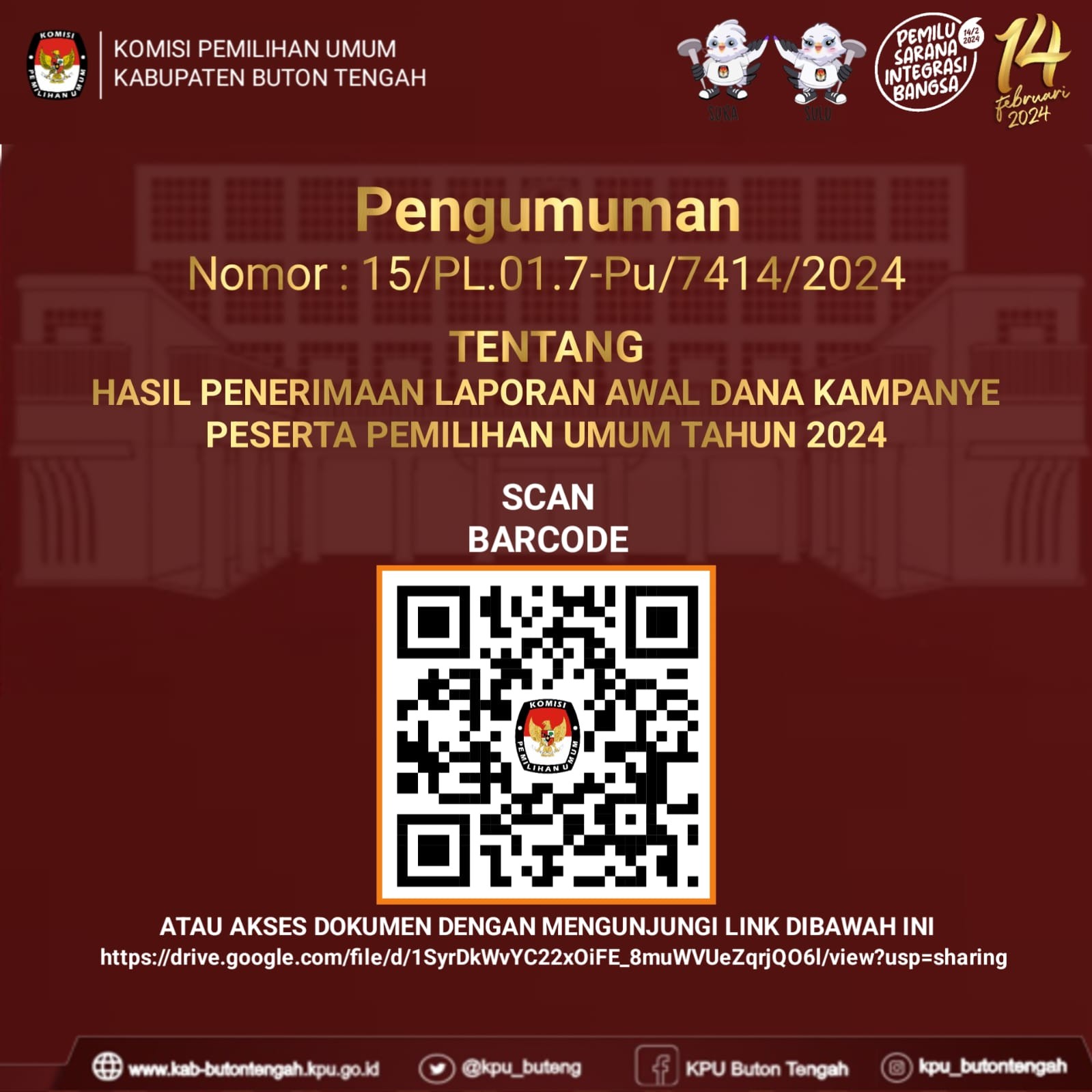 #TemanPemilih Berikut Pengumuman Nomor : 15/PL.01.7-Pu/7414/2/2024 tentang hasil Penerimaan Laporan Awal Dana Kampanye (LADK) Peserta Pemilihan Umum Tahun 2024 KPU Kabupaten Buton Tengah.....