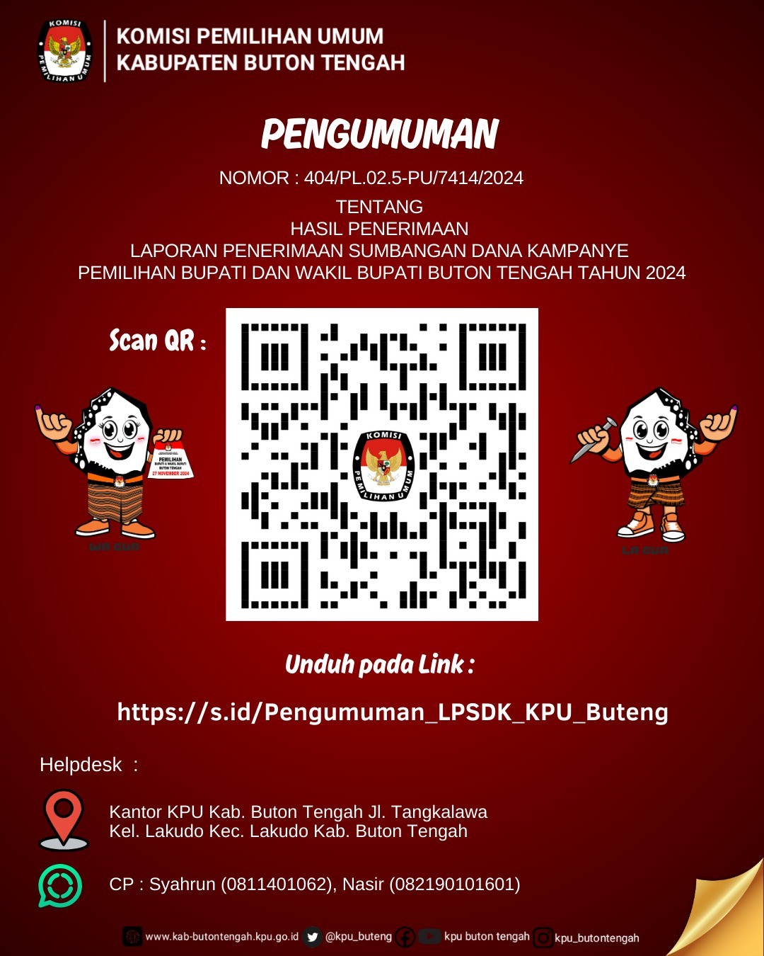 #TemanPemilih, berikut pengumuman KPU Kabupaten Buton Tengah Nomor: 404/PL.02.5-PU/7414/2024 Tentang Hasil Penerimaan Laporan Penerimaan Sumbangan Dana Kampanye Pemilihan Serentak Tahun 2024. #KPUMelyani #PilkadaSerentak2024....